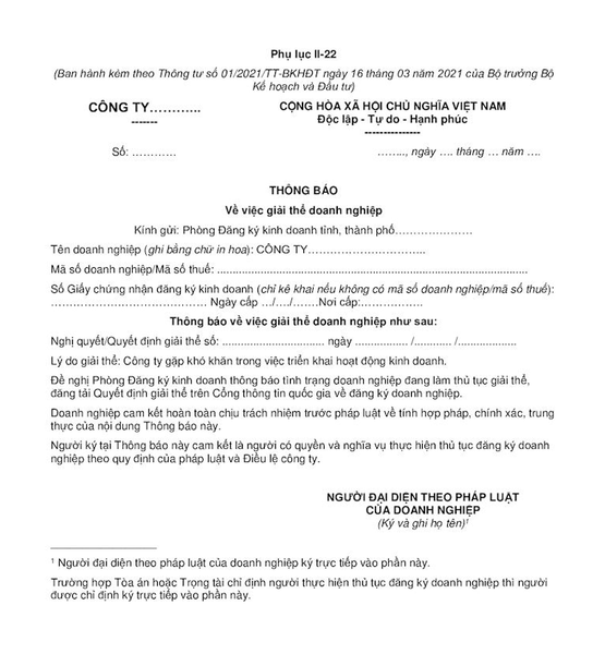 Mẫu phụ lục II-22 – Thông báo về việc giải thể doanh nghiệp