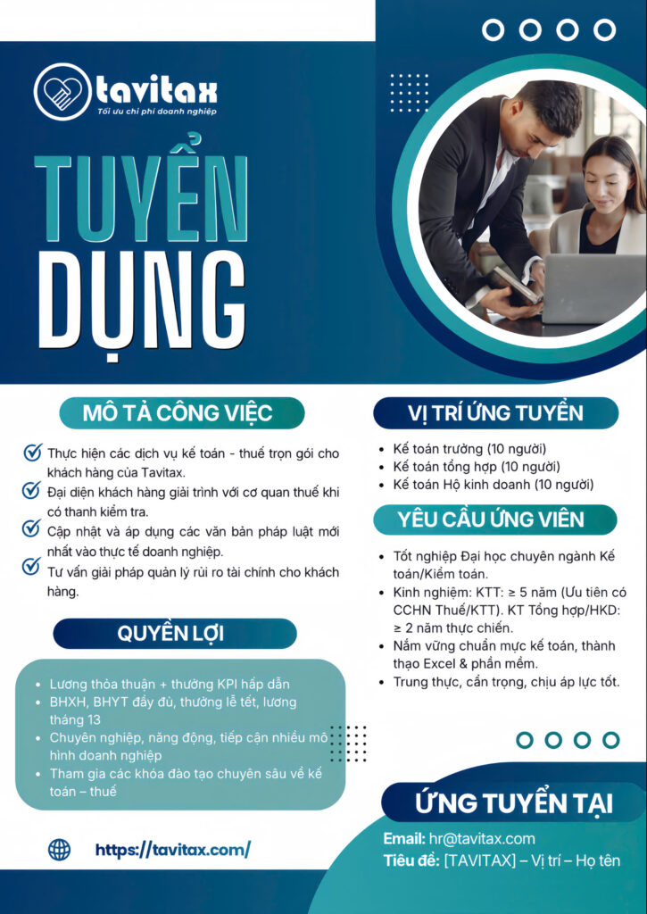 - 10 Kế toán tổng hợp: Thực hiện hạch toán, lập báo cáo tài chính, kê khai và quyết toán thuế (VAT, TNDN, TNCN).